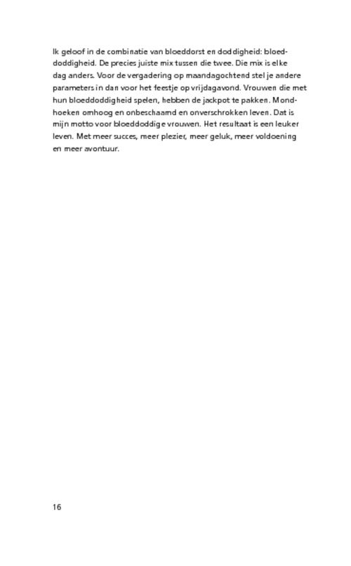 Maar ze krabbelde op. Werd een ander mens. Kreeg een leuker leven. En ontdekte dat zakelijk succes nog makkelijker is als je bloeddorst met een scheutje doddigheid combineert. Mond- hoeken omhoog en schaamteloos en onverschrokken leven. Dat is haar advies aan vrouwen die leuk, succesvol, provocerend, bloeddorstig en toch vooral ook aantrekkelijk willen zijn.